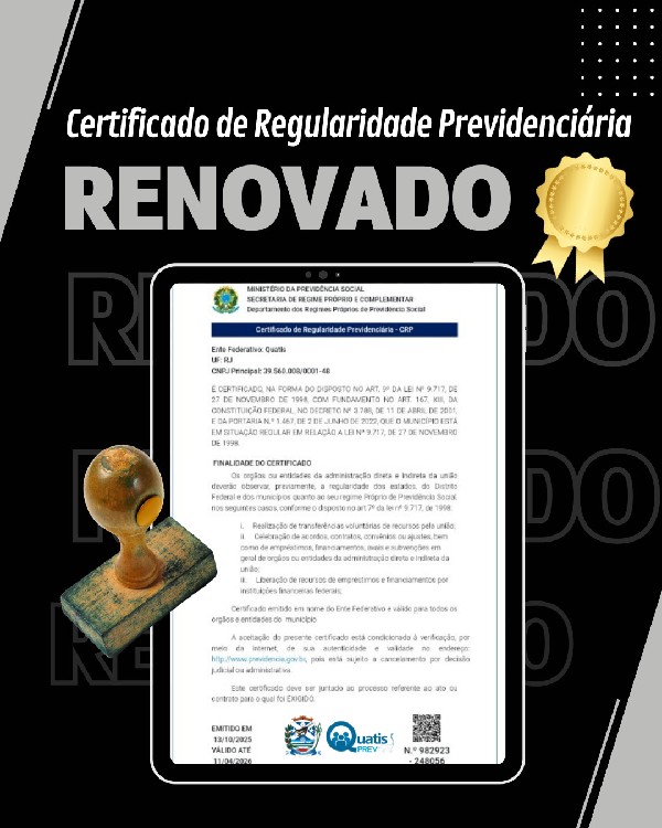 O QuatisPrev tem o orgulho de anunciar que o município de Quatis está com seu Certificado de Regularidade Previdenciária (CRP) devidamente renovado!